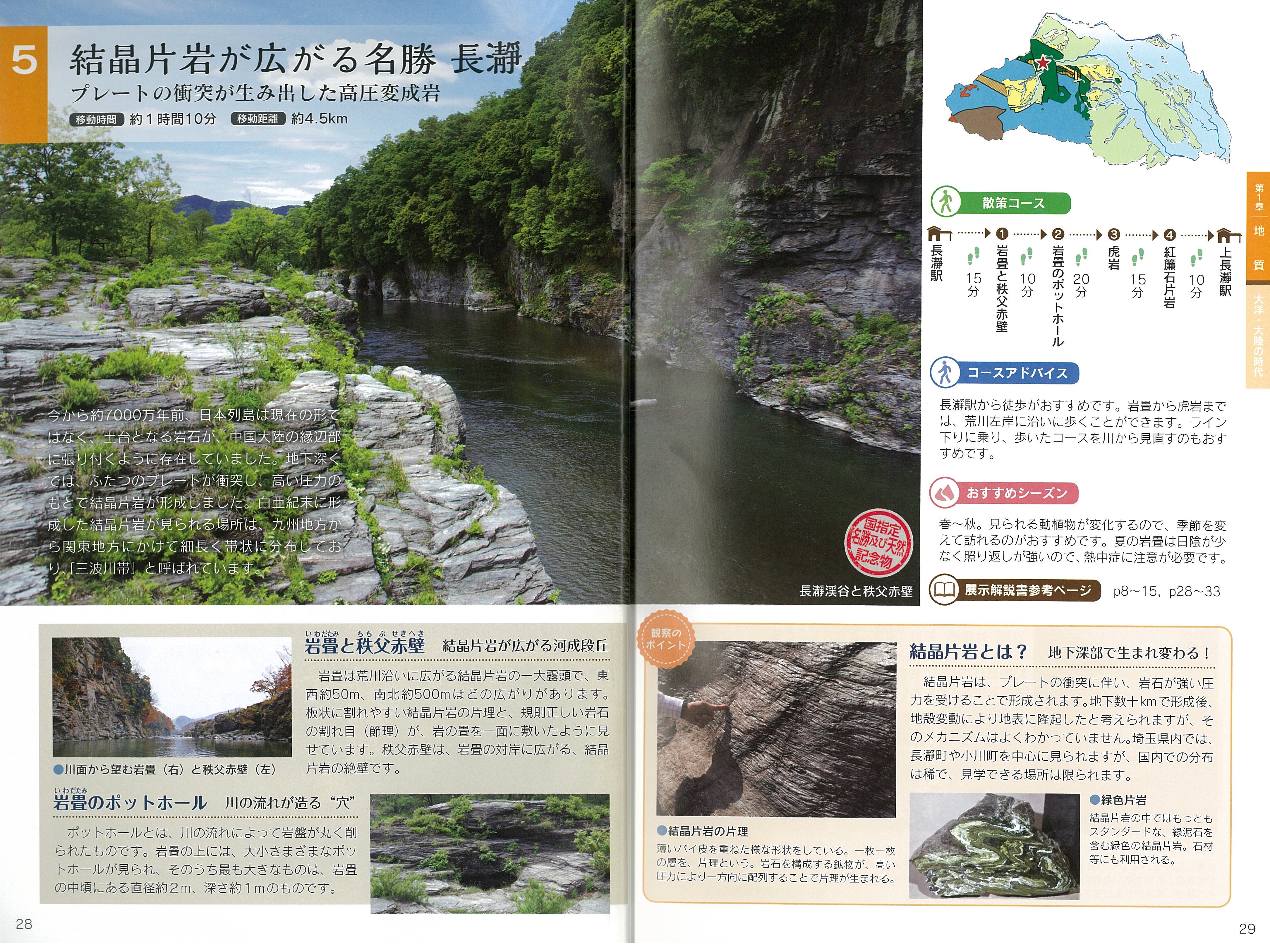 本誌では、実際に現地を訪れて、地域の自然の成り立ちや仕組み、人と自然の関わりについて学ぶことができる観察コースを紹介しています。地質分野14コース、生物分野13コースを厳選しました。コースごとに観察テーマを設定しており、分野の枠を超えてそれぞれの地域における自然の特徴を肌で感じられるように作成しています。皆様が自然観察に出かけて埼玉の豊かな自然と触れ合うきっかけとして本誌を御活用いただければ幸いです。