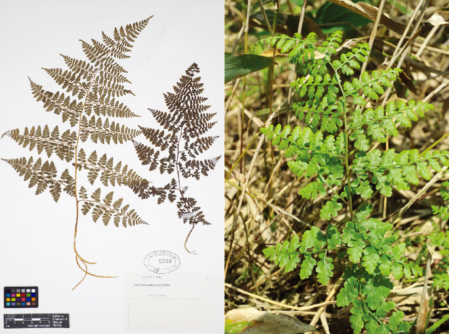 山地の林床に生育する夏緑性のシダ植物で、高知県の手箱山で発見されたことからこの名がある。国内では関東地方以西の本州、四国、九州に分布する。県内で現在確認されている生育地は1地点のみで、胞子をつけない小さな株が1個体生存しているだけであるため、極めて危機的な状況にある。シカの食害や自然遷移が主な減少要因と考えられている。 |