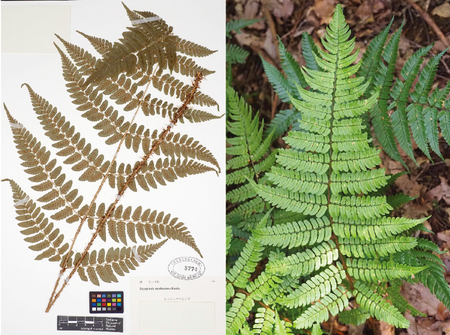 やや乾燥した薄暗い林床に生育する常緑性のシダ植物で、国内では関東地方以西の暖温帯に分布する。県内では日高市とその周辺地域に生育するが、いずれの生育地もスギ・ヒノキ植林下であることから、伐採による消失の危機に常に晒されている。同じく暖温帯域に分布するマルバベニシダやサイゴクベニシダと形態がよく似通っている。 |
