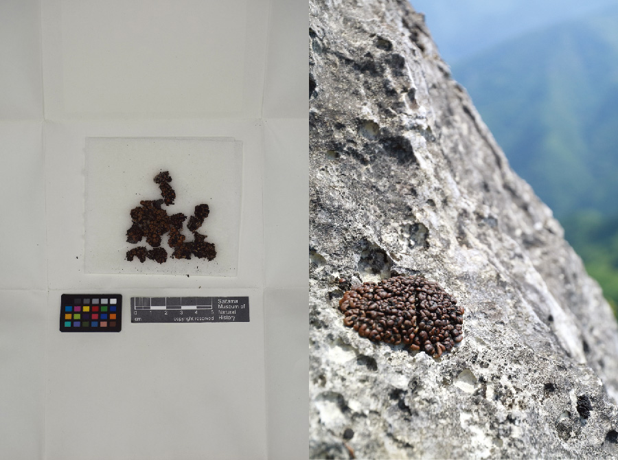 石灰岩に直に着生する、焦茶色の鱗片状の固着地衣。日本固有種で、本州から四国、九州にまれにみられる。県内では既存の山地で継続して生育が確認されているが、1982年以降新たな生育地は見つかっておらず、量的にも少ないことから絶滅が危惧されている。 |