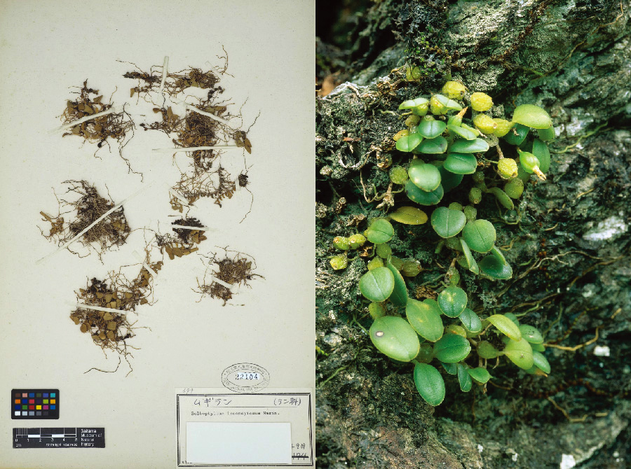常緑樹林内の樹上や岩上に着生する小型の着生ラン。葉は肉質で分厚く、6~7月に黄色みのある白い花を咲かせる。県内では樹林内にある岩上で確認されているが、確認地点は1地点のみである。自生地の大きな変化はないが、地点数が少ないため絶滅の危機に瀕している。県内希少野生動植物種に指定されている。 |