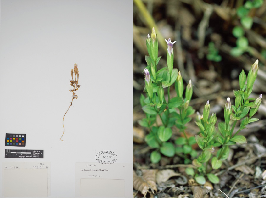 深山の石灰岩地に生える一年草または越年草。秩父山地、南アルプス、伊吹山にまれに生育する。1952年に秩父市十文字峠付近で清水大典氏によってはじめて発見された。花は9~10月で、細長いがくから淡紫色の花弁の先がのぞく。県内では山地から亜高山の石灰岩地の岩棚や周辺の草地などに生育するが、山地が限られるうえにシカの食害や自然遷移などにより減少傾向にあり、絶滅が危惧されている。県内希少野生動植物種に指定されている。 |