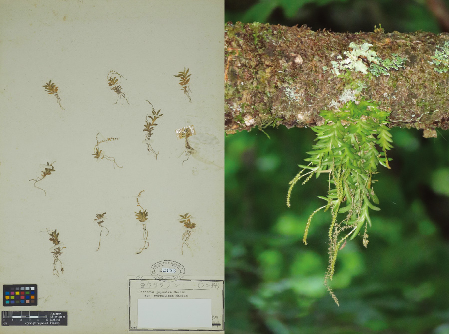樹幹や岩上に着生する小型の着生ラン。分布の中心は暖温帯である。県内では空中湿度の高い山地の渓畔林に生育する。2011年版の埼玉県レッドデータブック植物編では絶滅とされたが、2014年に、40年ぶりに再発見された。シカの食害や土壌侵食などにより着生木の生育環境が悪化しており、依然として絶滅の危機に瀕している。 |