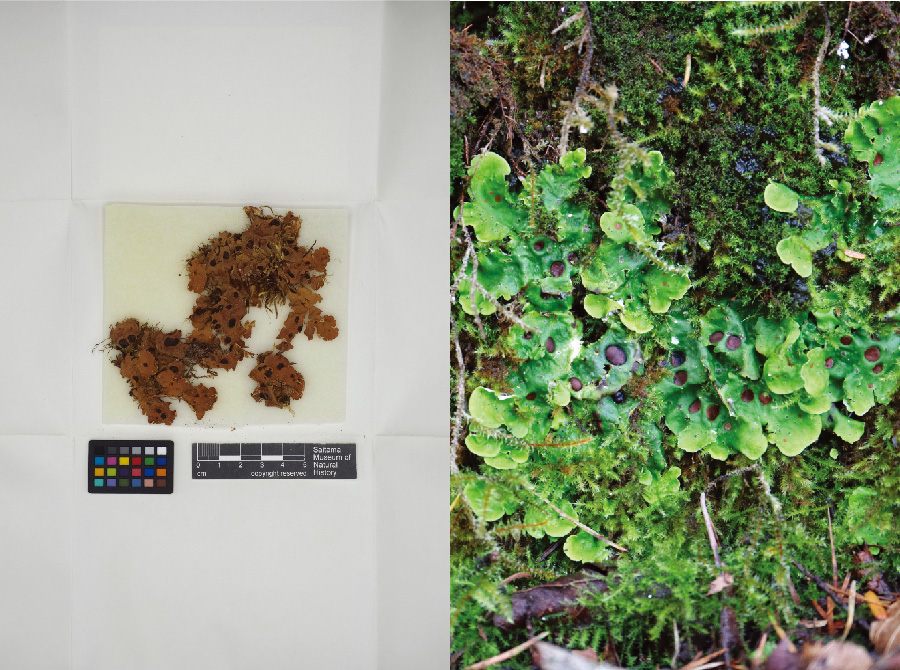 石灰岩や石灰質土壌に生育する葉状地衣。日本固有種で、本州中部以南、埼玉、長野、山梨県内の石灰岩地のみで知られている。県内では秩父地域の亜高山帯で継続して確認されているが、量的には少なく、絶滅が危惧されている。 |