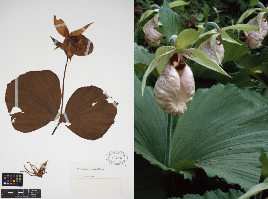 樹林、特にスギ林や竹林の林床に生育するラン科植物。葉は扇円形で放射状の脈があり、縦じわが多い。4~5月、茎の先端に直径10センチほどの大きな薄黄緑色の花を咲かせる。県内にはかつて各地に自生地があったが、園芸採取や自然遷移などにより個体数が減少している。 |